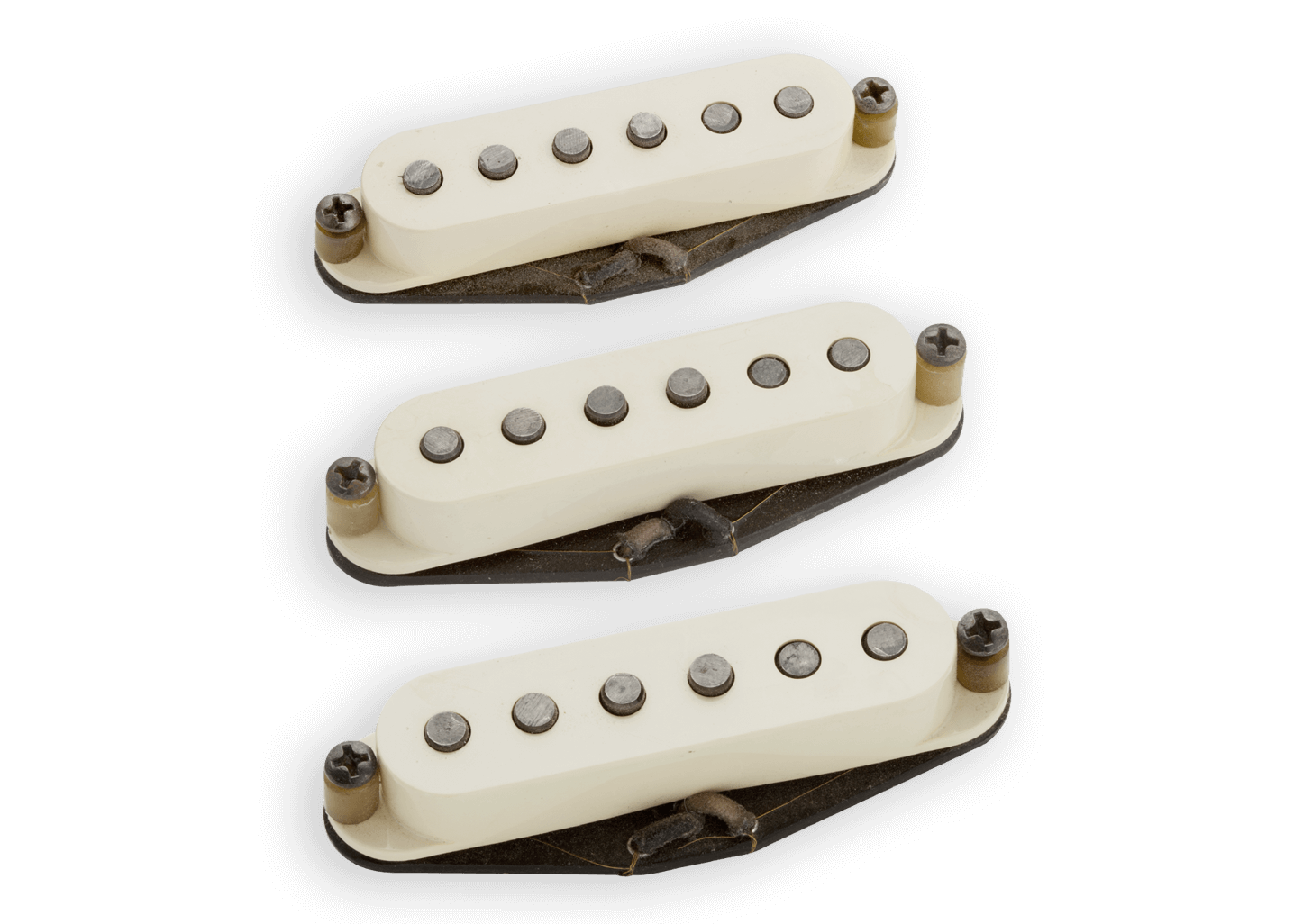 Premium vintage-voiced Strat set replicating the look and tone of 1950s single-coil pickups with added output and aged character. Ideal for players seeking authentic vintage chime and sparkle with the added punch for modern dynamics. Hand-aged finish, rod Alnico 2 magnets on the neck and middle, and a hotter wound bridge position.