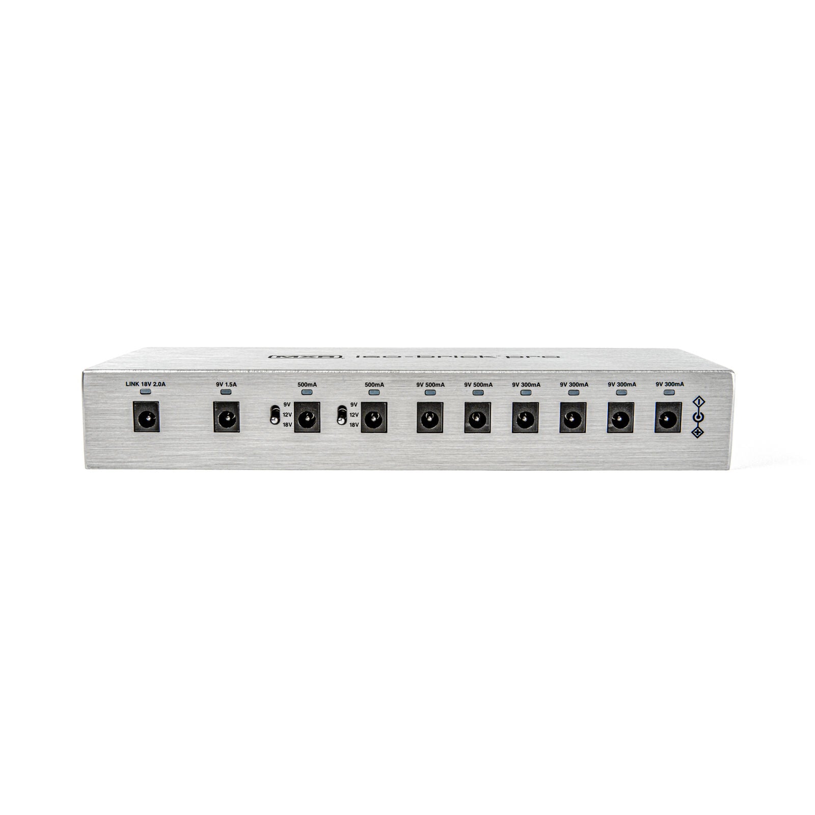 Outputs: 6 × 9 V DC (fixed; four at 300 mA, two at 500 mA) + 2 × switchable 9/12/18 V DC (500 mA) + 1 × high-current 9 V DC (1.5 A) + 1 × 18 V DC link output (2.0 A)