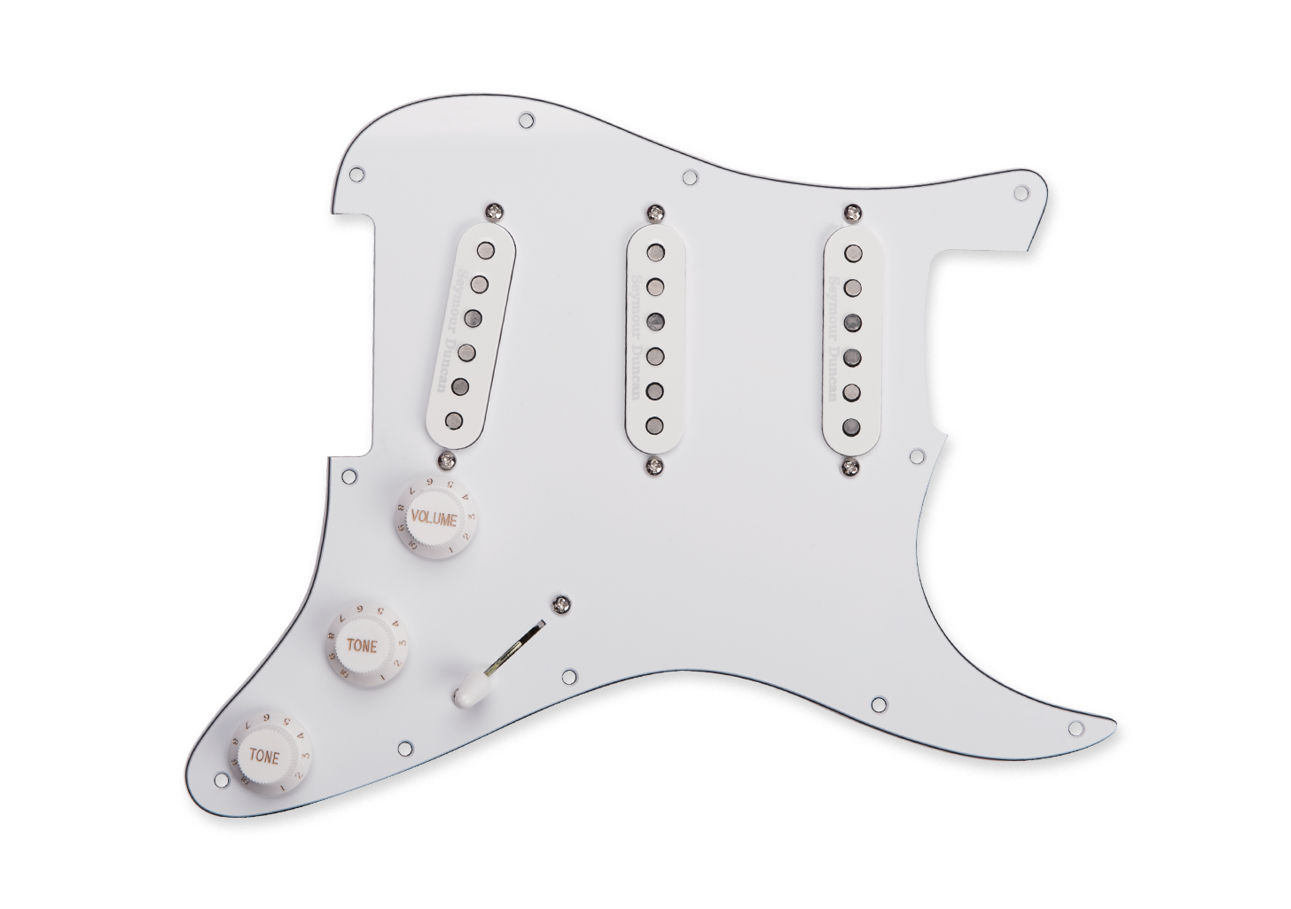 A fully pre-wired pickguard featuring Duncan’s California ’50s Strat pickups—clear, bright, and authentically vintage. Built with staggered Alnico 5 magnets and cloth wire, this drop-in assembly delivers sparkling ’50s tone with tight low end and chime. Includes premium electronics for true plug-and-play installation.