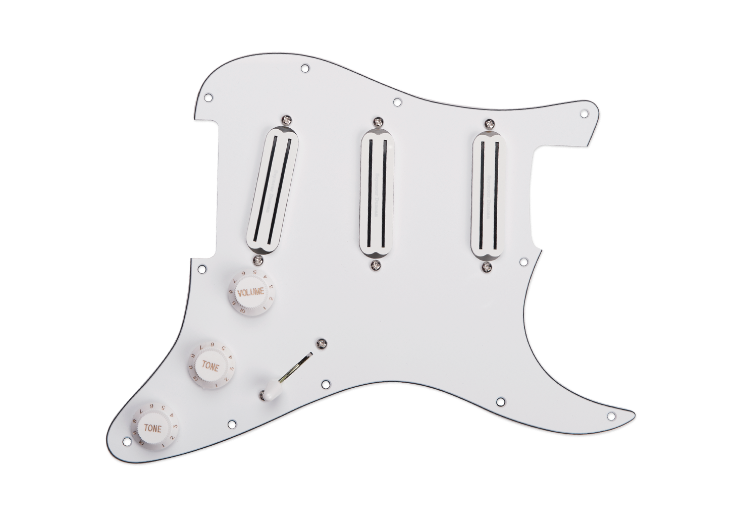 Pre-wired pickguard assembly for Strat-style guitars loaded with three high-output “Hot Rails” humbuckers and the Liberator solder-free system. Perfect for players who want humbucker punch in a Strat format, whether for chords or high-gain lead work. Hand-built in Santa Barbara, CA.